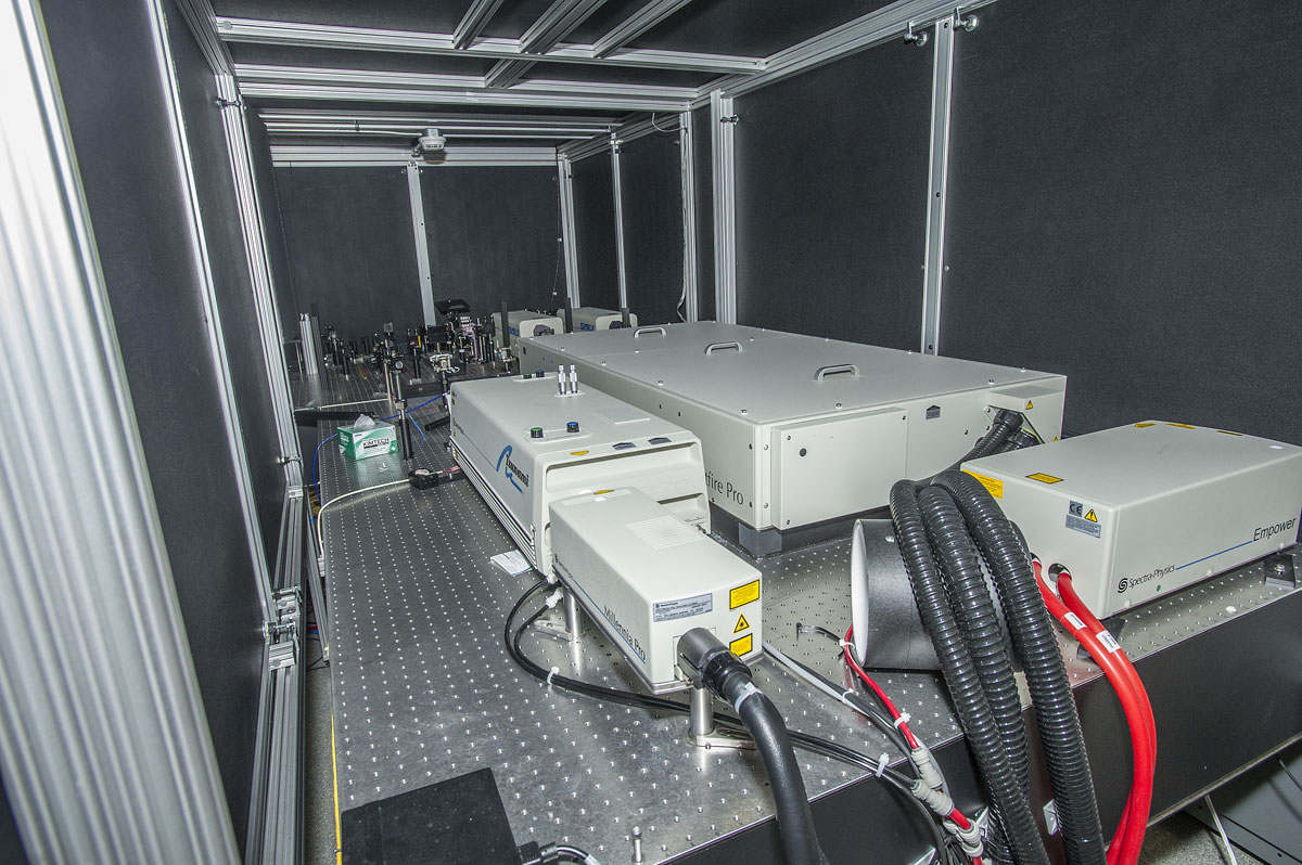 ultrafast lasers require a pump laser. so to get the ultrafast, very tuneable laser pulses you actually need two lasers, and you shoot one of the lasers into the other. you can also add non-linear optics for more control over the wavelength or high-energy amplifiers for more power. at the end, your laser is more like a system of glowing boxes that takes up a huge table. each one of these components is very expensive. they generate a lot of heat and usually require several water cooling systems. they all have to be perfectly aligned to one another, so they have to be on the same, level table, and that table shouldn't shake everytime a train or semi rolls by your lab and it has to have taps for the optical mounts to route the laser around the table and to your experiment.